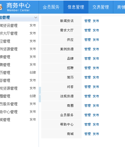 方式(一):如您已注册并登录,可点击网站首页右上角“免费发布信息”,直接进入会员商务中心的“信息管理”窗口页面,如下图: