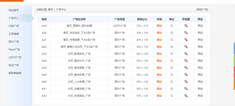 (二)广告中心服务列表页面详细列出了关于网站首页与内页各广告的广告位置/类型/规格等,客户可根据自身情况自行选择,确定后可通过网站客服/电话/微信等进行联系洽谈。如下图: